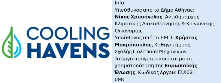 Η Αθήνα χαρακτηρίζεται από ιδιαίτερες περιβαλλοντικές και μικροκλιματικές συνθήκες, οι οποίες επηρεάζουν άμεσα την ποιότητα ζωής των κατοίκων και τη λειτουργία του δημόσιου χώρου. Παρατηρούνται ακραίες θερμικές περίοδοι, παρατεταμένοι καύσωνες και έντονες βροχοπτώσεις που προκαλούν τοπικές πλημμύρες. Οι πιέσεις αυτές εντείνονται λόγω της εκτεταμένης κάλυψης του εδάφους από αδιαπέρατες επιφάνειες, που περιορίζουν τη φυσική απορροή των ομβρίων και αυξάνουν τη θερμική επιβάρυνση. Παράλληλα, η απουσία υδάτινων στοιχείων και λύσεων αστικού σχεδιασμού που βασίζονται στη βιώσιμη διαχείριση του νερού μειώνει τη δυνατότητα του αστικού ιστού να λειτουργεί με φυσικό τρόπο και να προσφέρει συνθήκες άνεσης στους κατοίκους. Το έργο “Cooling Havens: Water-Powered Neighborhood Cooling and Engagement Stations” προτείνει την υλοποίηση καινοτόμων παρεμβάσεων αστικού σχεδιασμού σε επιλεγμένες γειτονιές της Αθήνας, με στόχο την επανένταξη του υγρού στοιχείου στον δημόσιο χώρο και τη δημιουργία ανθεκτικών συστημάτων φυσικού δροσισμού με αξιοποίηση υδάτινων πόρων. Μέσα από λύσεις βασισμένες στη φύση (Nature-based solutions – NBS) και τεχνικές επαναχρησιμοποίησης μέσω συστημάτων ανάκτησης νερού για άρδευση διαμορφώνονται μπλε και πράσινες υποδομές που λειτουργούν ως φυσικοί μηχανισμοί ρύθμισης του μικροκλίματος, συμβάλλοντας στη μείωση της αστικής θερμικής νησίδας και στον περιορισμό των επιπτώσεων των ακραίων καιρικών φαινομένων/συνθηκών.