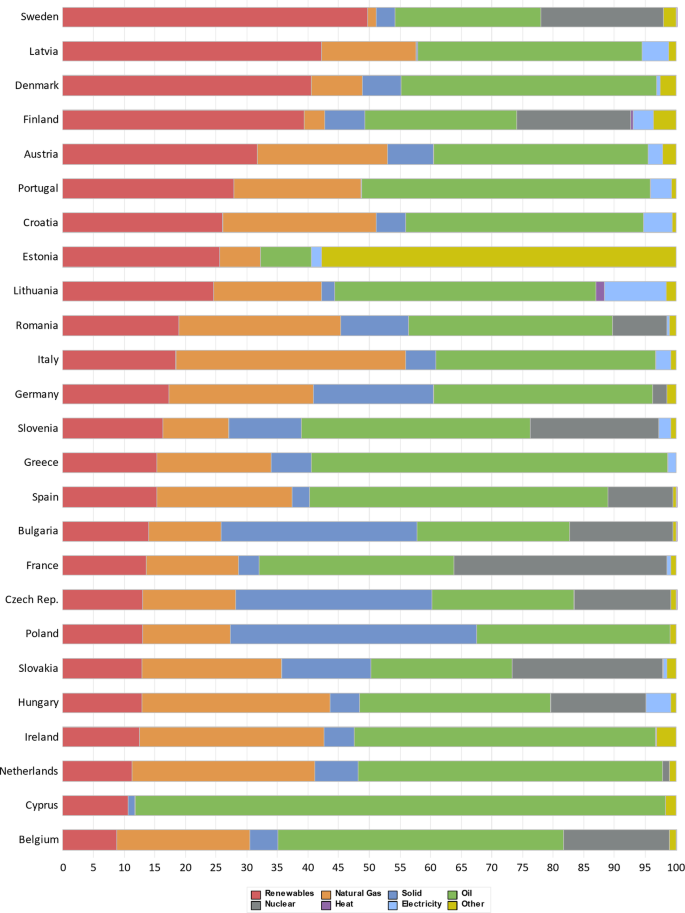 Παρόλο που το μερίδιο των ανανεώσιμων πηγών ενέργειας στο ενεργειακό μείγμα έχει αυξηθεί από τις αρχές της δεκαετίας του 2000, η ΕΕ στο σύνολό της εξακολουθεί να εξαρτάται σε μεγάλο βαθμό από τα ορυκτά καύσιμα (Γράφημα 1). Το 2022, το πετρέλαιο και το φυσικό αέριο αντιπροσώπευαν το 60% του ενεργειακού εφοδιασμού της ΕΕ, ενώ οι εισαγωγές κάλυψαν πάνω από το 63% της ακαθάριστης διαθέσιμης ενέργειας.